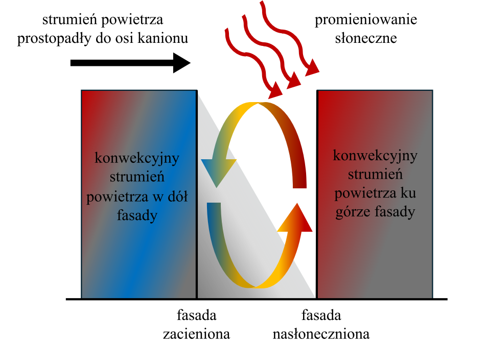 Mniejsza prędkość przepływu powietrza w mieście przekłada się w sposób bezpośredni na wentylację wnętrza budynków, powodując nawet kilkukrotne ograniczenie przepływu powietrza w mieszkaniach [21]. Stosuje się tutaj dodatkowo rozróżnienie na mieszkania wentylowane jednostronnie (posiadające otwory okienne na jedną stronę świata) oraz na mieszkania o krzyżowym przepływie powietrza (posiadające otwory okienne skierowane przeciwlegle w dwóch kierunkach). Naukowcy z Aten wykazali, że potencjał wentylacji naturalnej, zarówno w mieszkaniach jednostronnych, jak i krzyżowych, jest istotnie ograniczony. Oszacowali oni, że przepływy powietrza w mieszkaniach z wentylacją naturalną zostają ograniczone o odpowiednio 82% i 68%, w porównaniu do mieszkań w lokalizacjach pozamiejskich [5]. Dodatkowo, autorzy zaobserwowali przepływ wirowy wewnątrz kanionu miejskiego, w warunkach kiedy strumień powietrza jest prostopadły do osi kanionu. Wewnątrz kanionu powietrze przepływa w dół jednej strony fasad budynków [5], potencjalnie strony która nie jest nasłoneczniona (Rys. 1). W takiej sytuacji, pomimo obserwowania ruchu powietrza, jego skuteczność w przewietrzaniu jest ograniczona, ponieważ dopływ świeżego powietrza do strumienia cyrkulującego jest niewystarczający.