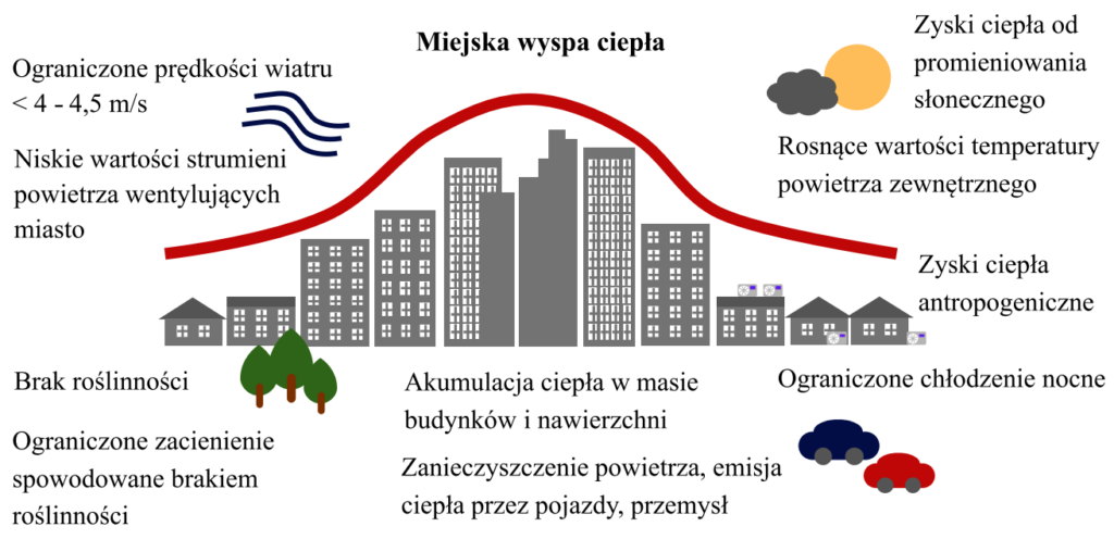 Miejską wyspą ciepła (ang. Urban Heat Island – UHI) określa się zjawisko polegające na występowaniu w obszarach zurbanizowanych istotnie wyższych wartości temperatury powietrza w porównaniu z terenami pozamiejskimi i zielonymi. Podwyższone wartości temperatury powietrza obserwuje się zarówno w ciągu dnia, jak i w nocy, kiedy to ciepło zakumulowane w masie budynków i nawierzchni jest stopniowo oddawane do otoczenia [2]. W konsekwencji średnia temperatura powietrza w mieście może utrzymywać się przez cały okres letni na poziomie wyższym o kilka stopni względem obszarów podmiejskich. W upalne dni różnica ta może wzrastać od kilku do maksymalnie nawet 20°C [14]. Efektem jest zwiększona liczba godzin występowania intensywnego dyskomfortu cieplnego, sięgająca w sezonie letnim kilkudziesięciu godzin [14] i mająca tendencję wzrostową [24,29]. Powstawanie miejskich wysp ciepła nie jest jednak ograniczone wyłącznie dla sezonu letniego i obserwowane jest także w zimie. Tutaj jednak jej obecność ma potencjalnie ochronny charakter, łagodząc warunki zewnętrzne w okresach występowania najniższych wartości temperatury zewnętrznej [13].