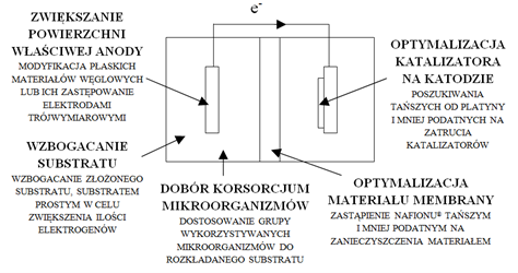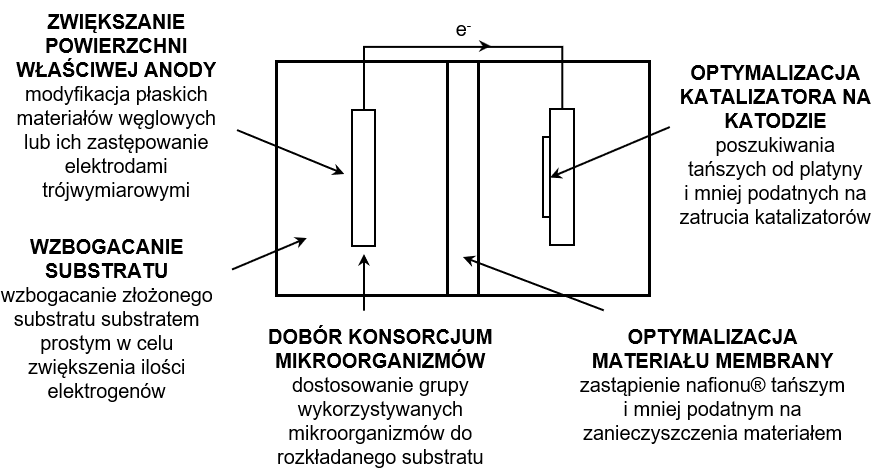Efektywność MFC zależy od parametrów i dopasowania poszczególnych komponentów systemu, tj. elektrod, membran, wykorzystanych mikroorganizmów i substratów. Na przestrzeni lat optymalizowano poszczególne elementy układu i tworzono różne konfiguracje po to, by uzyskać jak najlepsze parametry pracy systemu (rys. 2). Choć w początkowych MFC używano mikroorganizmy bez rozwiniętego DET, na przełomie XX i XXI wieku zaczęto poszukiwać bakterii cechujących się bezpośrednim kontaktowym transferem elektronów, co umożliwiało całkowitą rezygnację z wykorzystania mediatorów syntetycznych. Przy wykorzystaniu Geobacter sulfurreducens w MFC wykazano, że mikroorganizm tworzy stabilny biofilm na anodzie i podtrzymuje prąd po pełnej wymianie pożywki [4]. Wśród najbardziej znanych egzoelektrogenów wyróżnia się również mikroorganizmy z rodziny Shewanella [18].