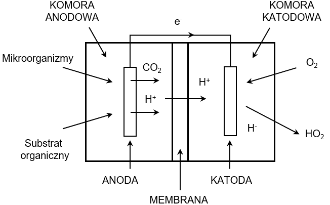 Mikrobiologiczne ogniwo paliwowe (rys. 1) jest urządzeniem, w którym energia elektryczna wytwarzana jest w procesie utleniania materii organicznej przez mikroorganizmy. Proces ten opiera się na potencjale redoks pomiędzy donorem i akceptorem elektronów, jednak, w przeciwieństwie do chemicznych ogniw paliwowych, zamiast bezpośredniej reakcji wodoru i tlenu, energię dostarczają żywe komórki bakteryjne [9].