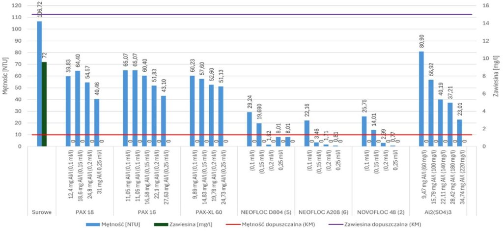 Badania nad procesem koagulacji objętościowej rozpoczęto od sprawdzenia skuteczności działania 20 koagulantów. W eksperymentach analizowano różne dawki koagulantów oraz różne czasy trwania szybkiego i wolnego mieszania. Na ich podstawie wybrano 7 koagulantów, dla których przeprowadzono po 3 eksperymenty dla dawek w zakresie 0,1–0,25 ml/l. Po procesie koagulacji objętościowej realizowano proces sedymentacji (t=10 min) oraz filtracji pospiesznej (v=5 m/h). Zmniejszenie mętności i stężenia zawiesiny poniżej wartości odpowiednio 15 mg/l i 10 NTU uzyskano dla 3 koagulantów (Rys.1).